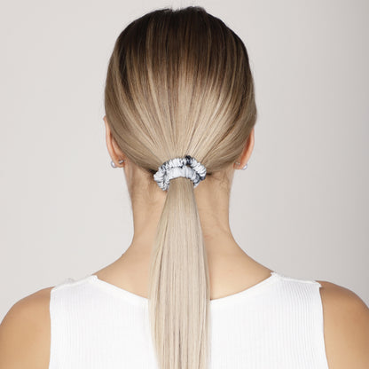 This unique skinny silk scrunchie is adorned with a beautiful tie and dye design in greys. I thoroughly enjoyed creating this lovely pattern. These elegant and luxurious silk scrunchies are really versatile and a great addition to your wardrobe to enhance anything you wear either for a special occasion, casually or professionally. You can wear this beautiful scrunchie around your hair or wrist.
