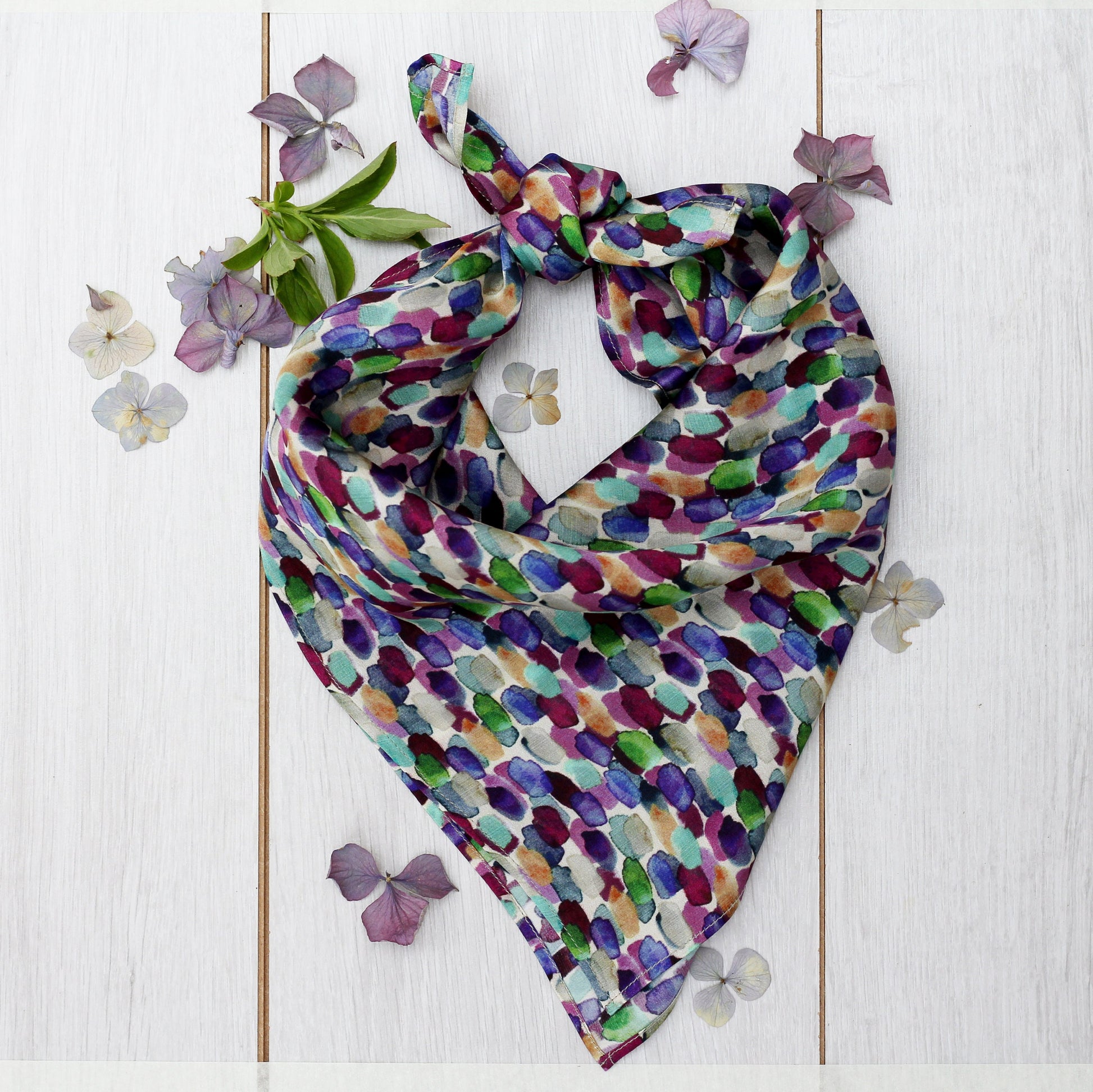 This unique silk neckerchief is adorned with a vibrant hand painted brush strokes design. I thoroughly enjoyed creating this lovely pattern. This elegant and luxurious scarf goes equally well with jeans, formal outfits or evening wear providing fashion as well as practicality. My designs answer the demands of smart office wear and equally the softer country look or evening wear. The fine quality silk provides warmth and luxuriously feel.