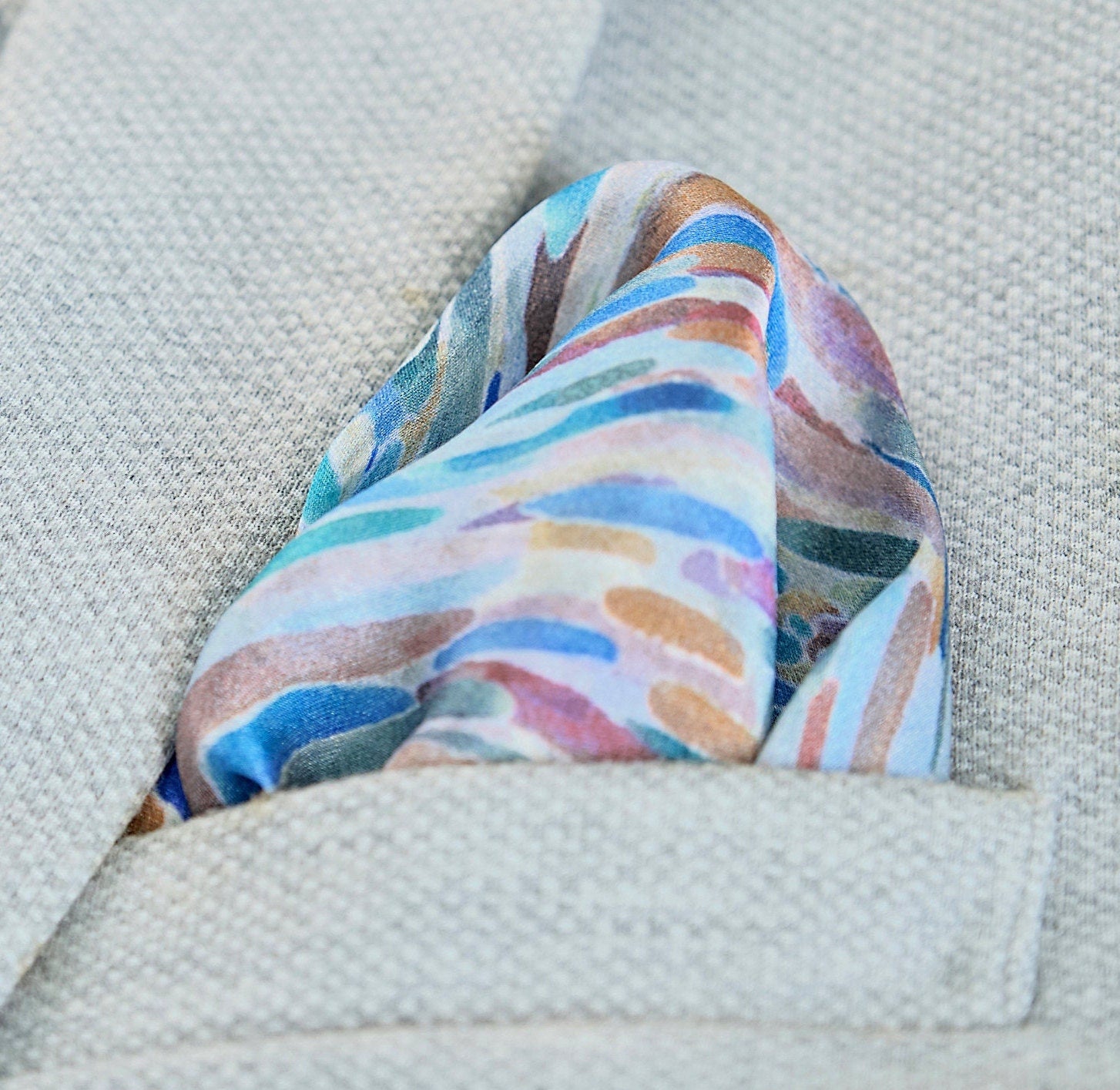 This unique luxury pocket square is made from very fine 100% silk and printed with a unique vibrant hand painted brush strokes design. Pocket squares are versatile men's accessories which instantly bring in pattern and style in the look. This special silk pocket square tucks nicely into your pocket to give that luxurious and special feel. It's a perfect gift for men for special occasions or for yourself.