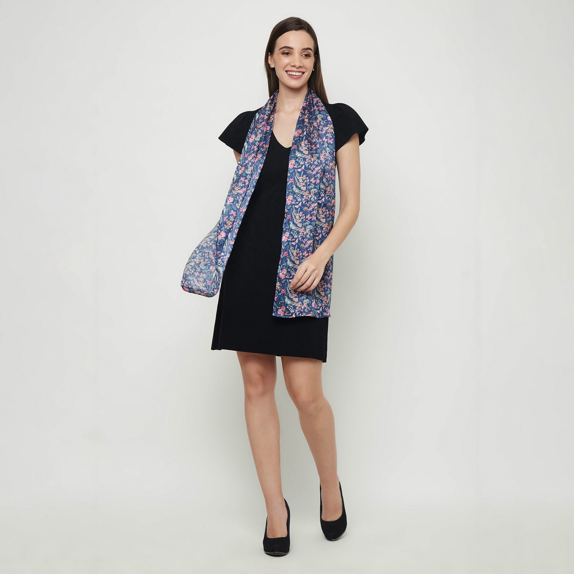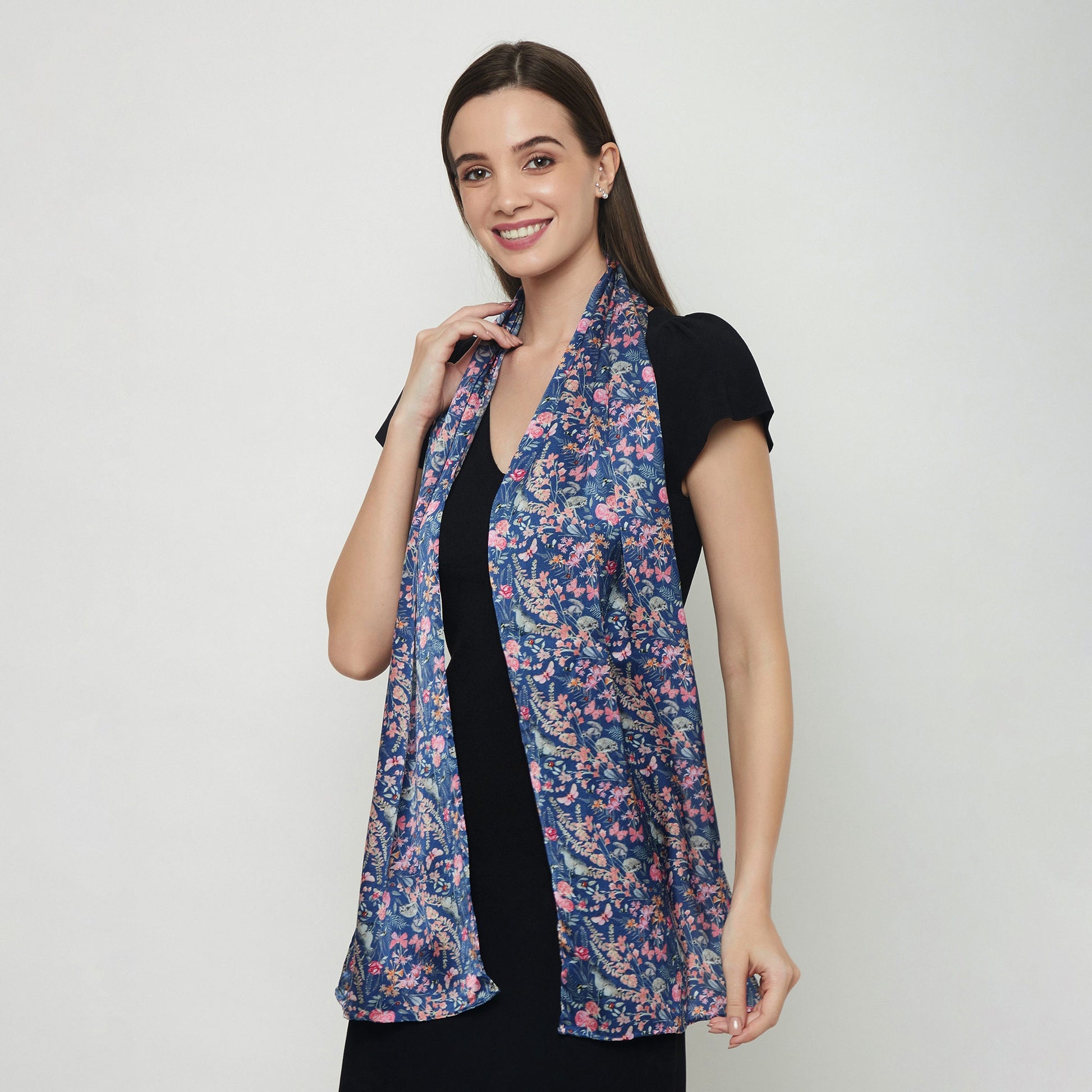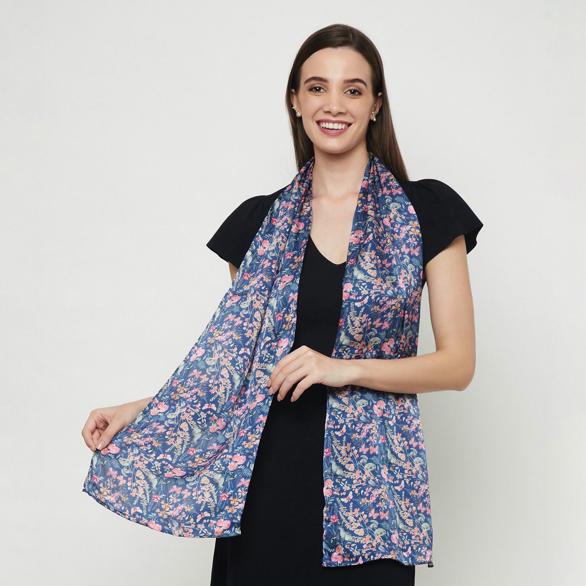This luxurious unique scarf for women is made from very fine 100% silk and is adorned with an exclusive hand painted botanical pattern which features a variety of flowers, bees, ladybirds, butterflies, hares, squirrels, and hedgehogs. It gives a little glimpse into a beautiful British garden. Preeti says she thoroughly enjoyed creating this lovely pattern. It is printed and handmade to the highest standard. This elegant and luxurious silk scarf goes equally well with jeans, formal outfits or evening wear providing fashion as well as practicality. The unique design answers the demands of smart office wear and equally the softer country look or evening wear. The fine quality silk provides warmth and luxuriously feel.