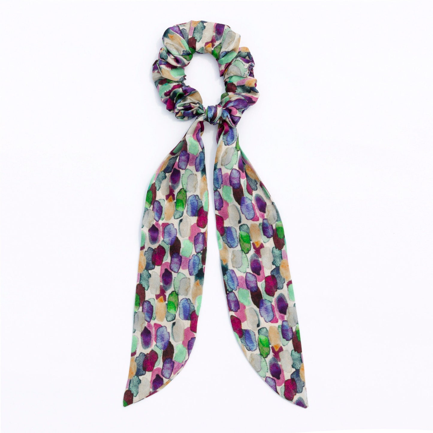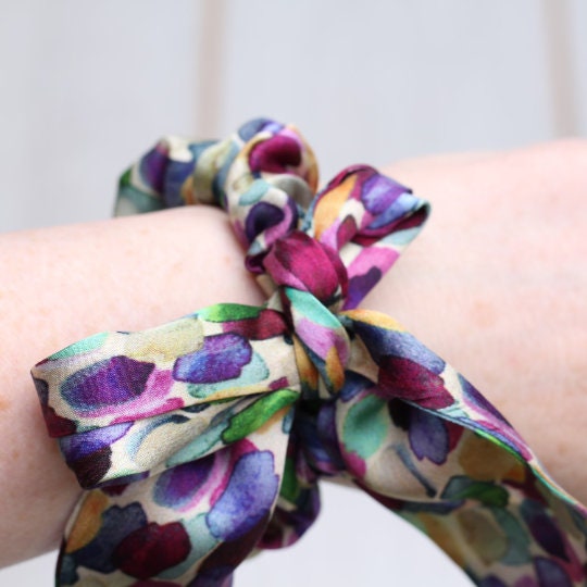 This unique silk scarf scrunchie is adorned with a beautiful vibrant hand painted brush strokes design. I thoroughly enjoyed creating this lovely pattern. These elegant and luxurious silk scrunchies are really versatile and a great addition to your wardrobe to enhance anything you wear either for a special occasion, casually or professionally. You can wear this beautiful scarf scrunchie around your hair or wrist.