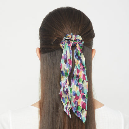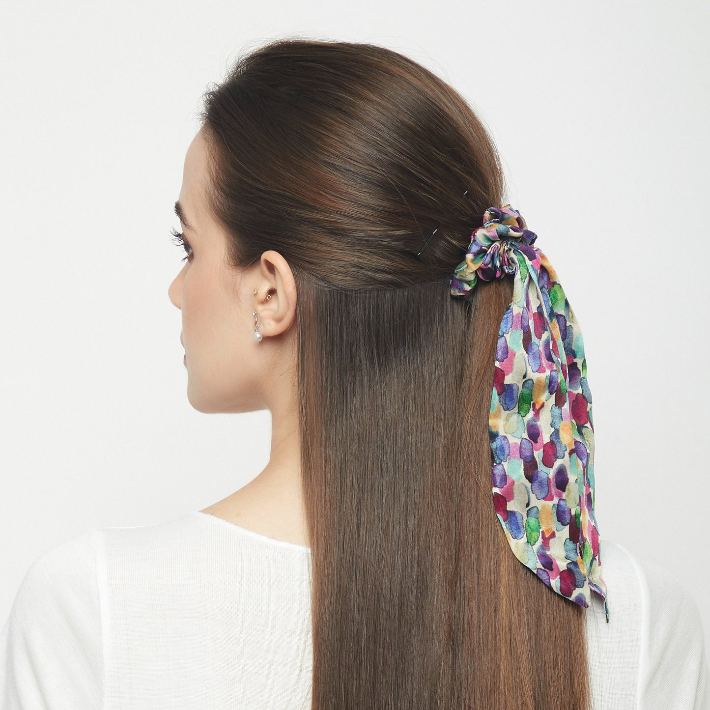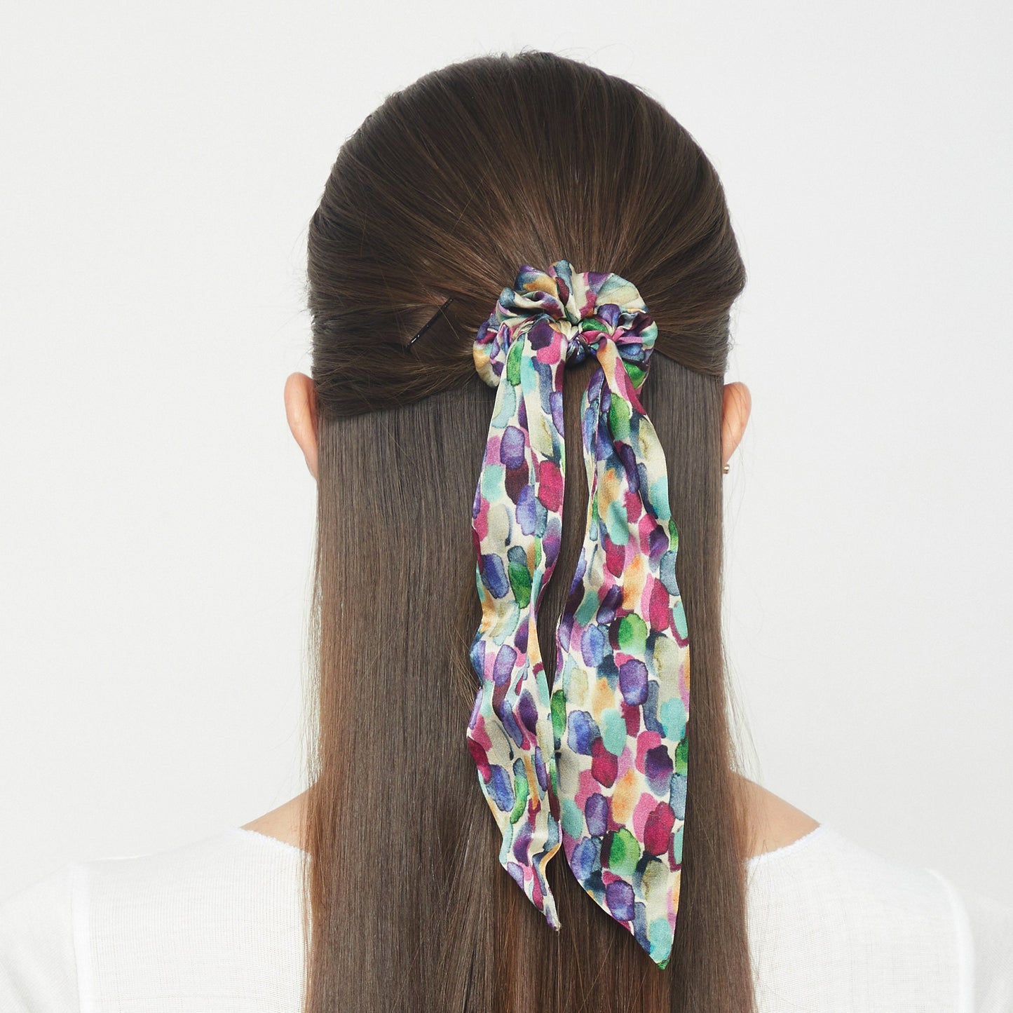 This luxurious hair accessory is really soft against your hair and is bound to get you compliments. These lovely scarf scrunchies are non-slip and non-snag. They are very gentle on your hair whether you use them for ponytail, half hair tie or around a bun. It can be used for hand decoration or purse decoration too. The elastic is covered with very high-quality satin silk which is printed with beautiful handmade pattern created by me. The soft silk prevents any friction with hair and reduces tension. Each one is special.