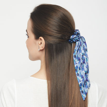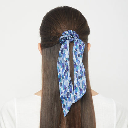 This unique silk scarf scrunchie is adorned with a vibrant hand-painted abstract design inspired by beautiful, mesmerizing shades of blue skies. I thoroughly enjoyed creating this lovely pattern. These elegant and luxurious silk scrunchies are really versatile and a great addition to your wardrobe to enhance anything you wear either for a special occasion, casually or professionally. You can wear this beautiful scarf scrunchie around your hair or wrist.